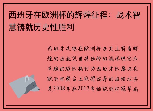 西班牙在欧洲杯的辉煌征程:战术智慧铸就历史性胜利